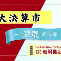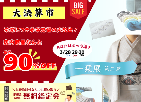やわらかもの・優しいお色目がお好みの方におすすめしたい「一栞展」、赤字覚悟のお買い得品満載の「大決算市」の二つを軸に、お着物以外なんでも買い取りの無料鑑定会も同時開催!内容盛りだくさんの企画となっております。ぜひ覗きにいらしてください。