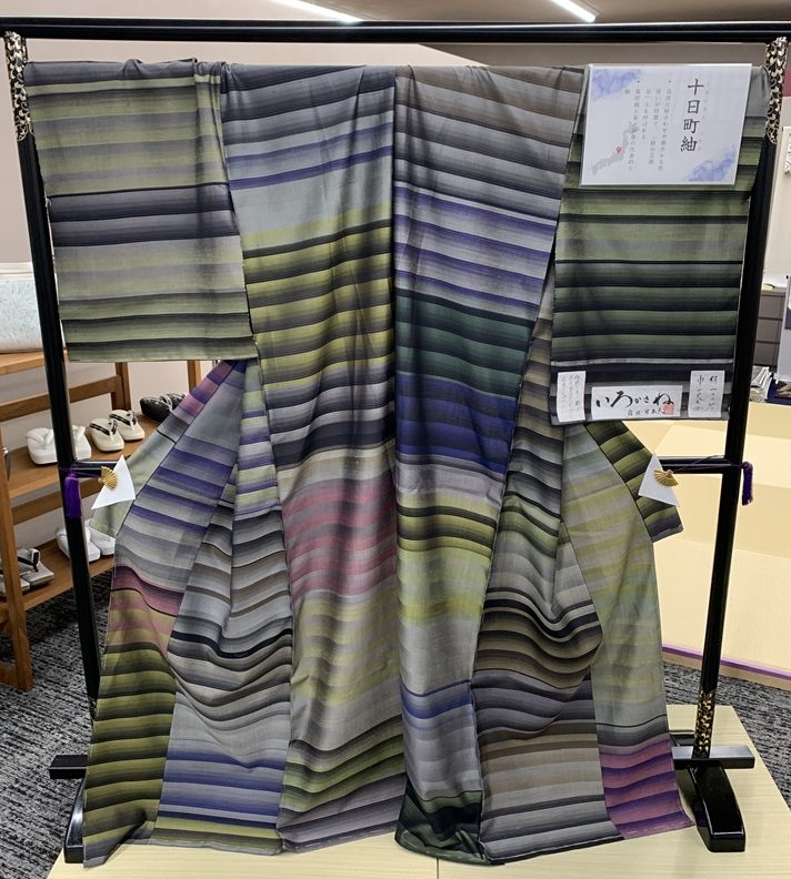 11の産地の絣と本松煙絣と絵絣といった技法の作品が展示され、ギャラリー内に所狭しと並びます。