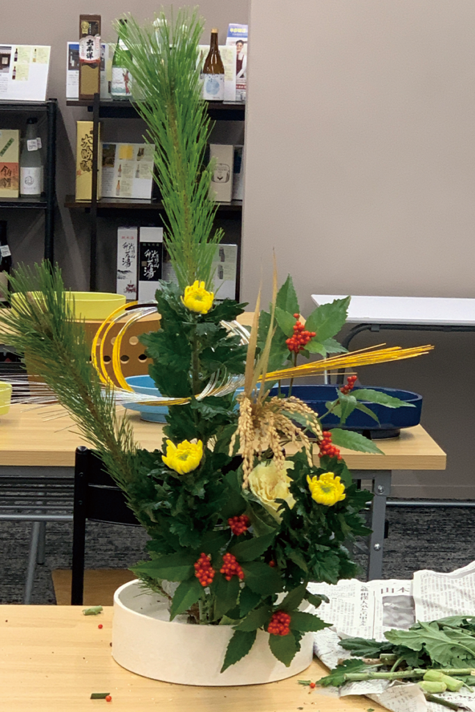 教室では、皆様が真剣な表情で枝の向きや実のバランスを整えていらっしゃいました。 金銀の水引を添えることで、ぐっとお正月らしい華やかさが増しますね。