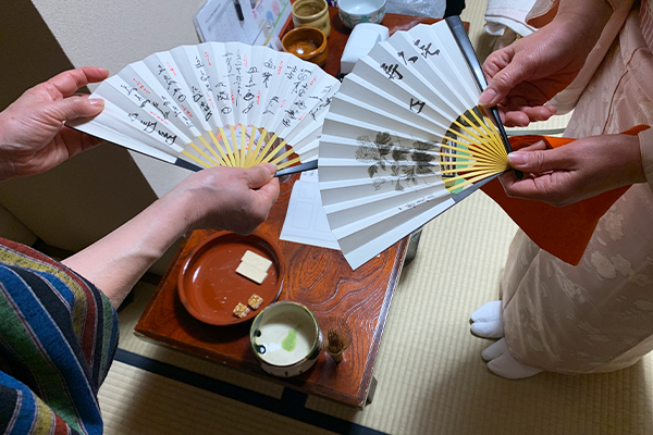 お稽古の合間には、生徒さんが新調された表千家の立派な扇子を、皆で拝見させていただく一幕も。こうした道具への慈しみも、茶道の醍醐味のひとつです。