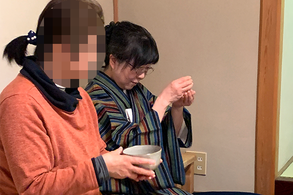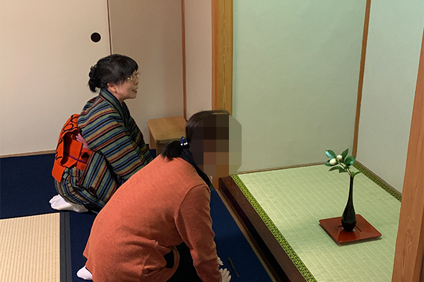 本日は体験の方もご参加くださいました。 お茶室への入り方や、お茶をいただく際の作法など、基本から丁寧にお伝えしました。