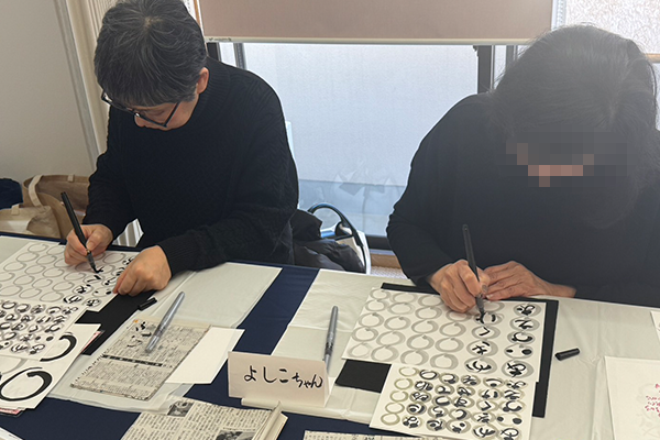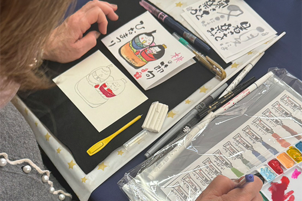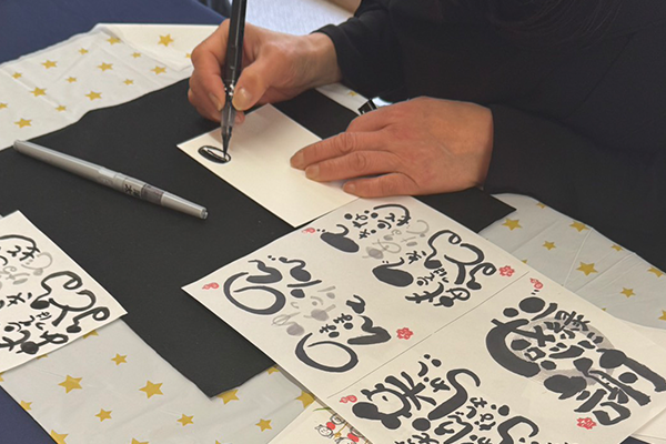 先生の明るい笑顔と優しいご指導のもと、参加者の皆さまと一緒に筆ペンを手に取りました。