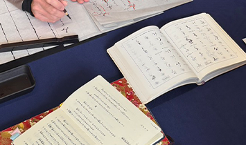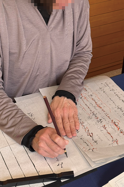 開かれた手本を傍らに、一筆一筆の運びを確認しながら進める丁寧な作業。