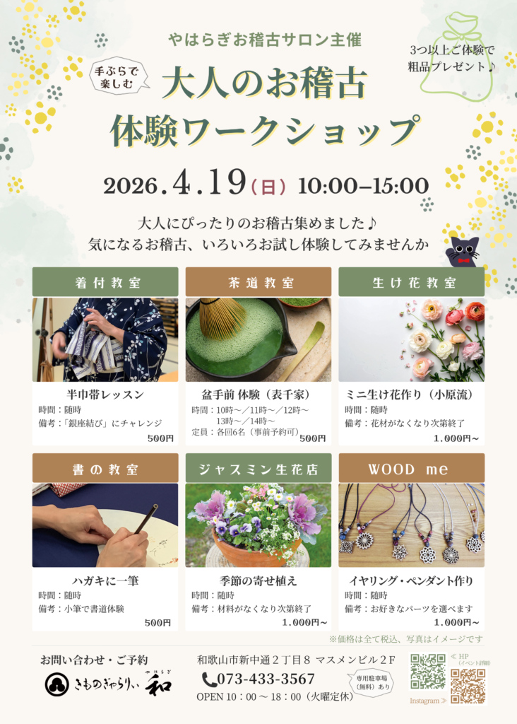 2026年4月19日(日)、やはらぎお稽古サロン主催「大人のお稽古 体験ワークショップ」を開催します。