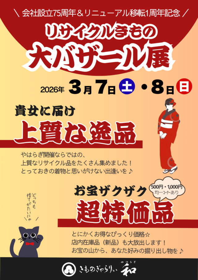 会社設立75周年&リニューアル移転1周年を記念して、リサイクル着物のお得な大バーゲンを開催します。