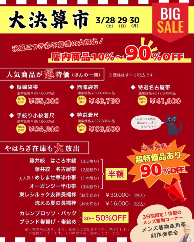 年に一度、決算につき赤字覚悟の大放出!店内商品がなんと10%~最大90%OFF。お得な商品がいっぱいです。