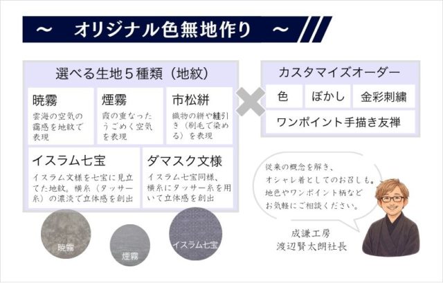 古典とモダンの融合したこだわりの訪問着や付け下げのほか、今回はあなただけの特別なオリジナル色無地もお作りいただけます。
